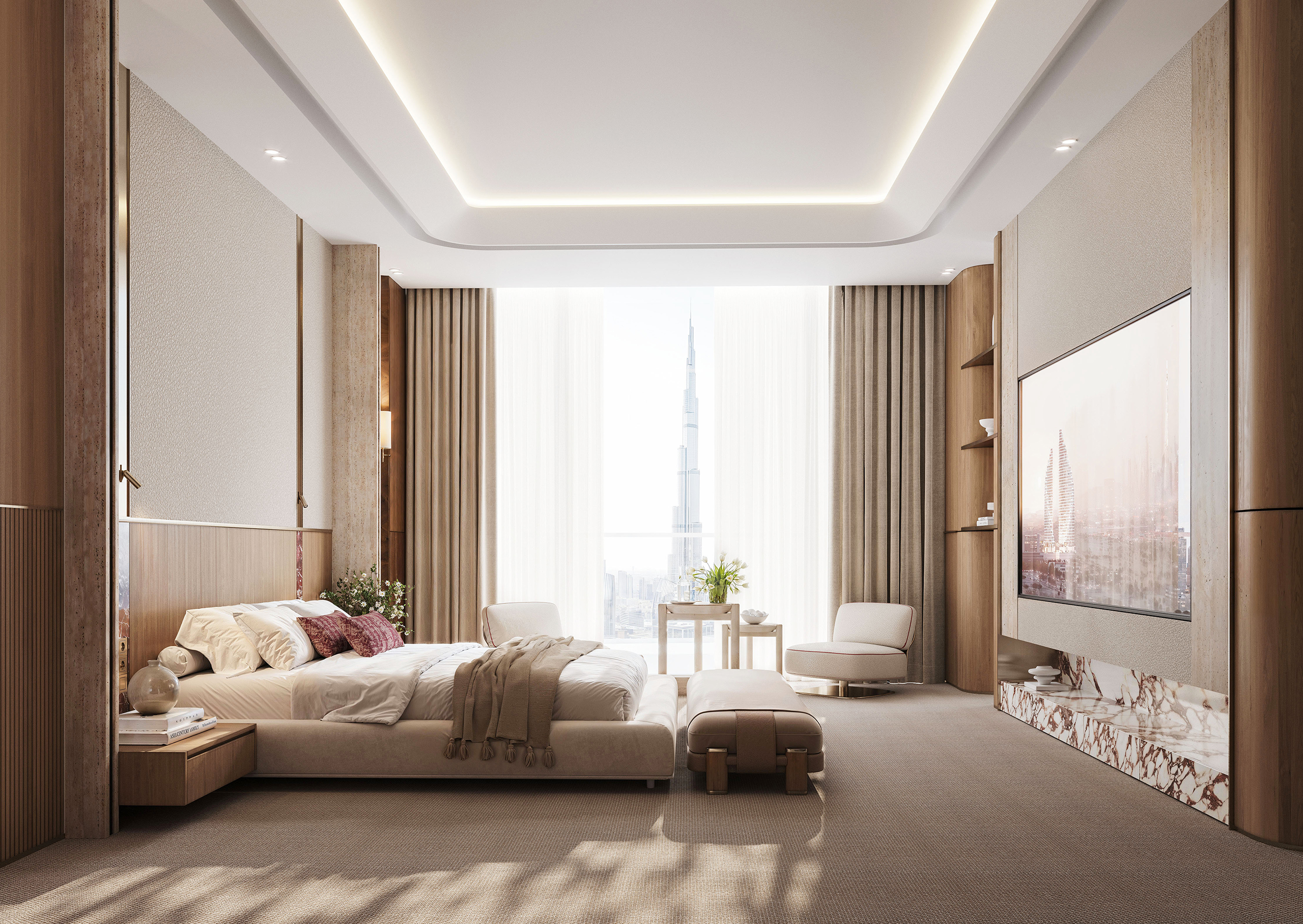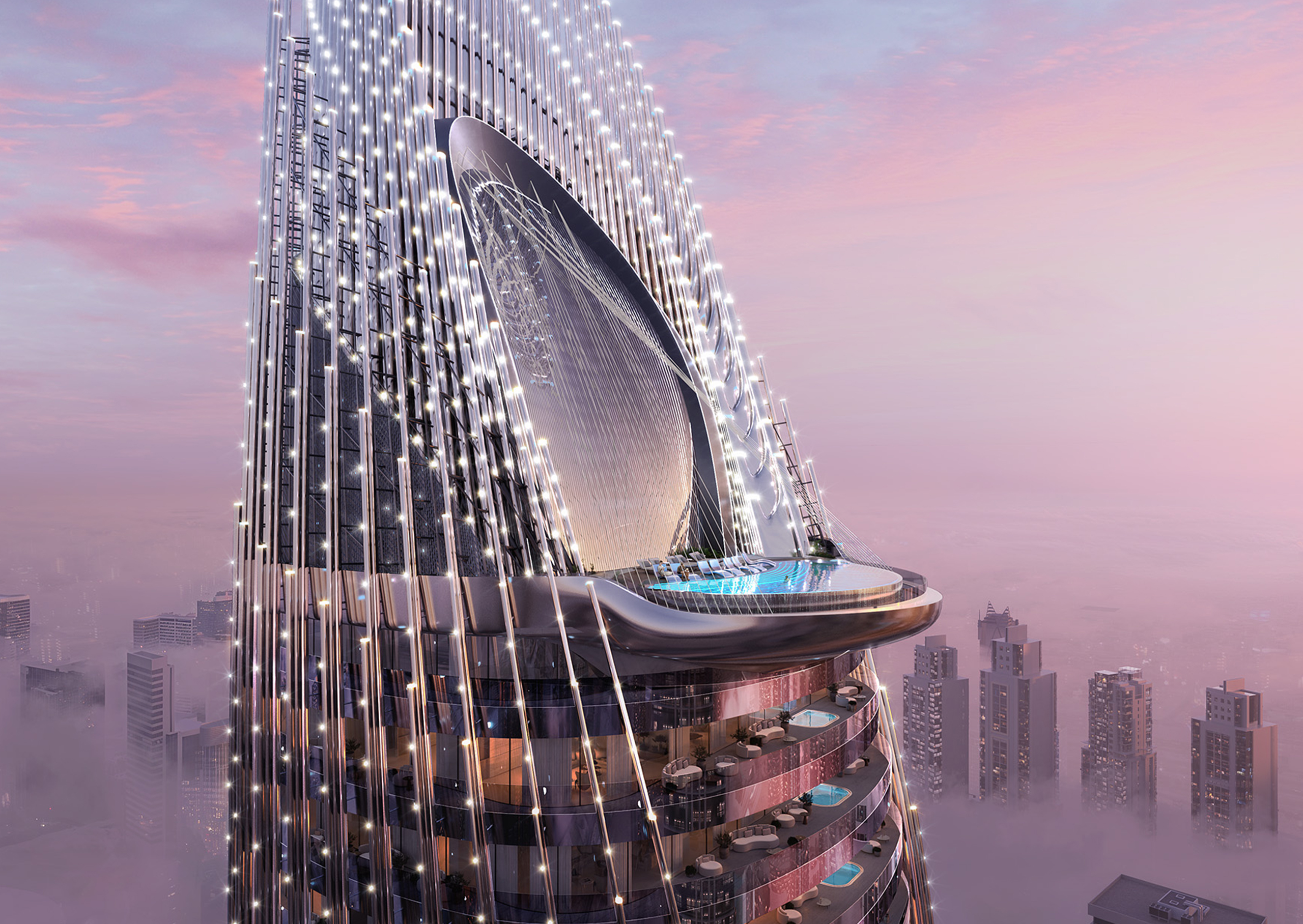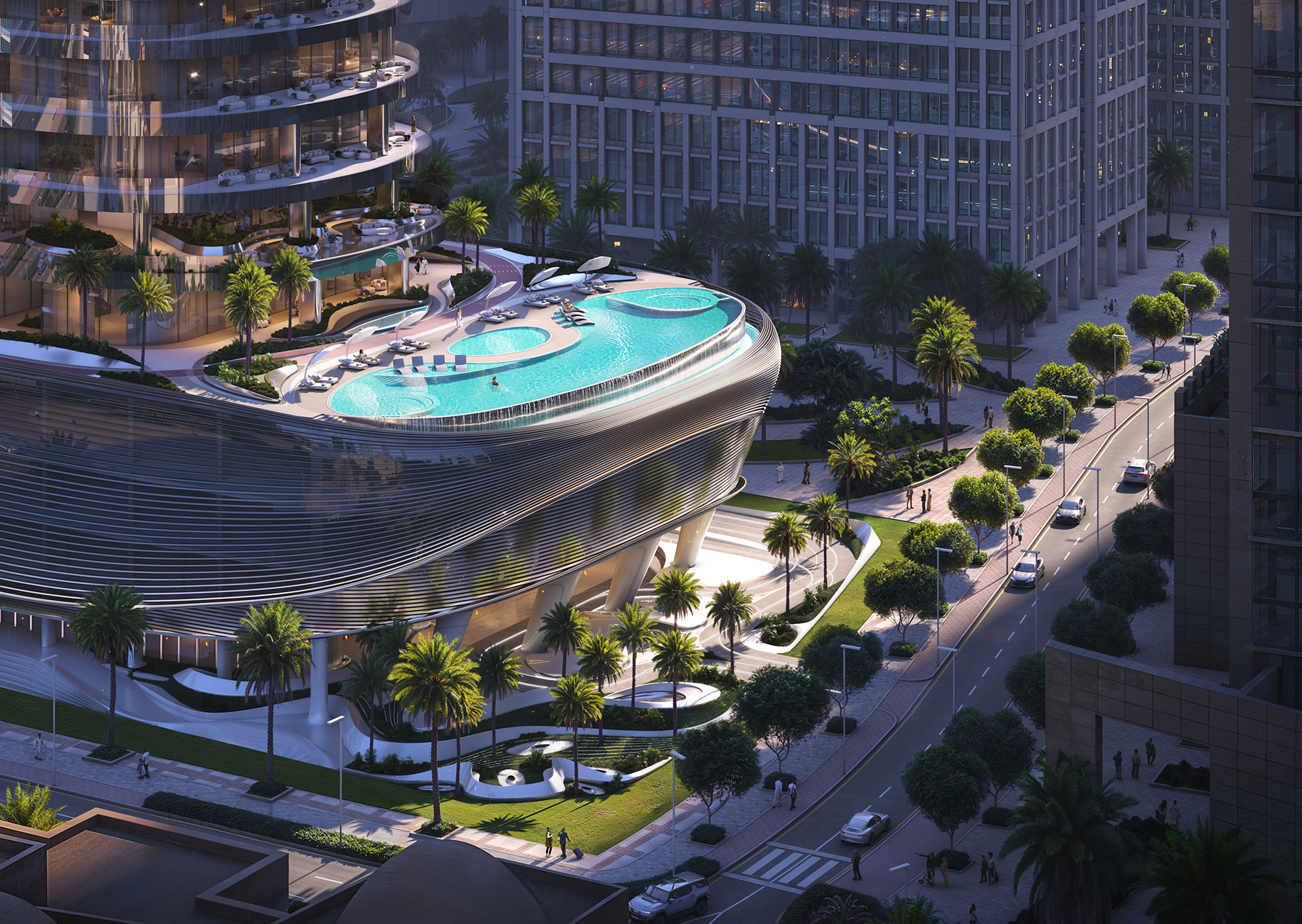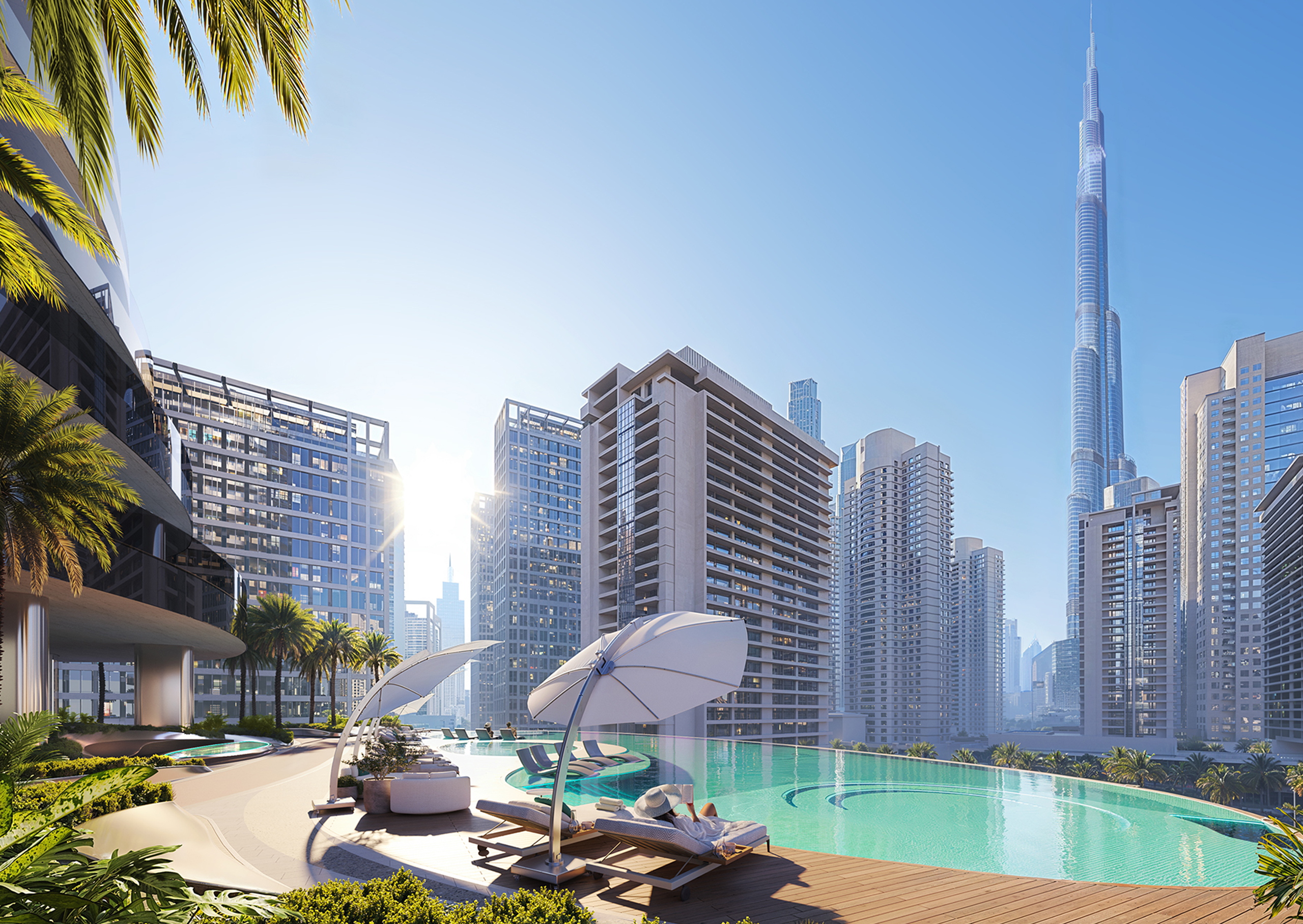 - Infinity sky pool at the tower’s crown, offering uninterrupted views of Burj Khalifa and Downtown Dubai