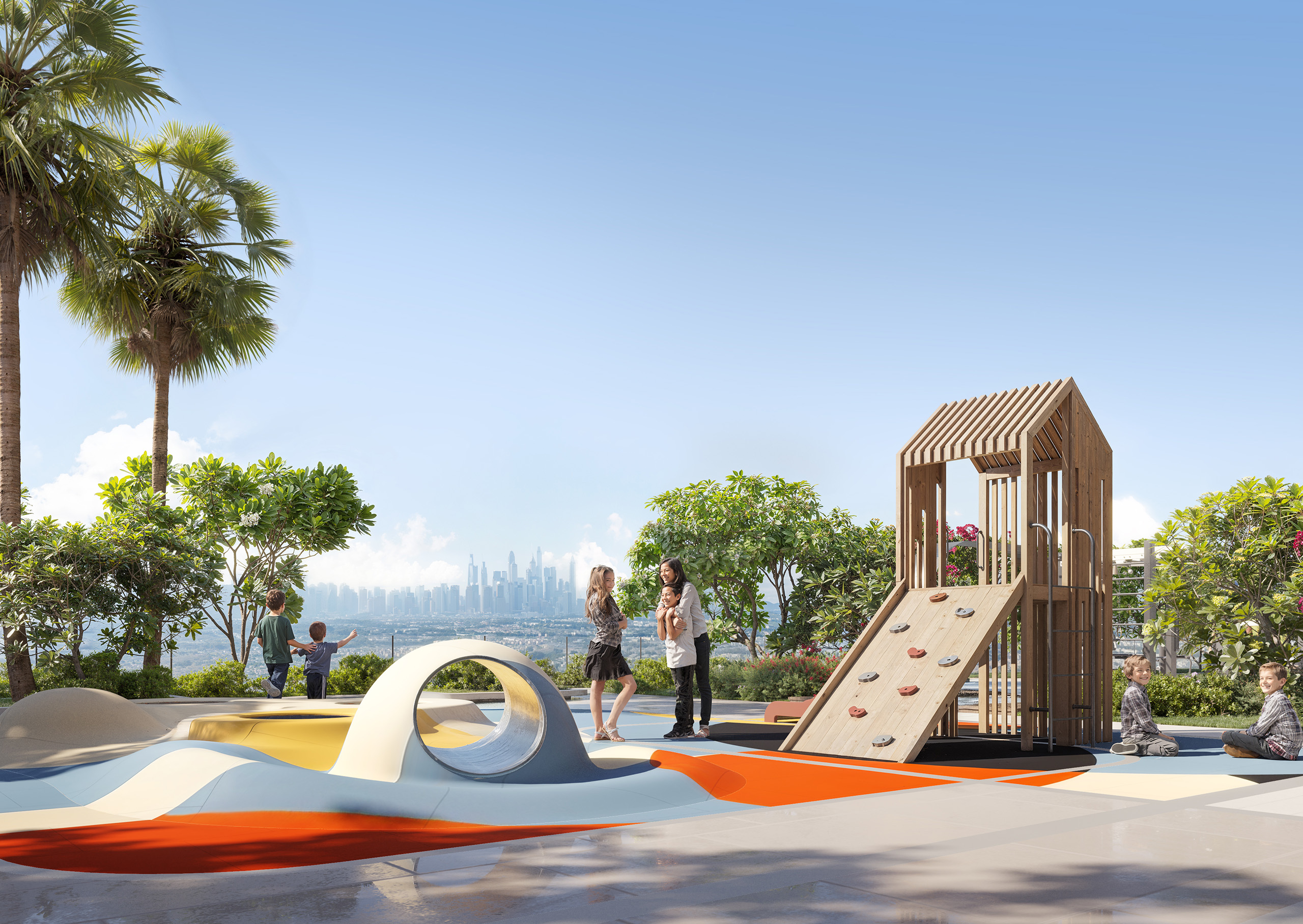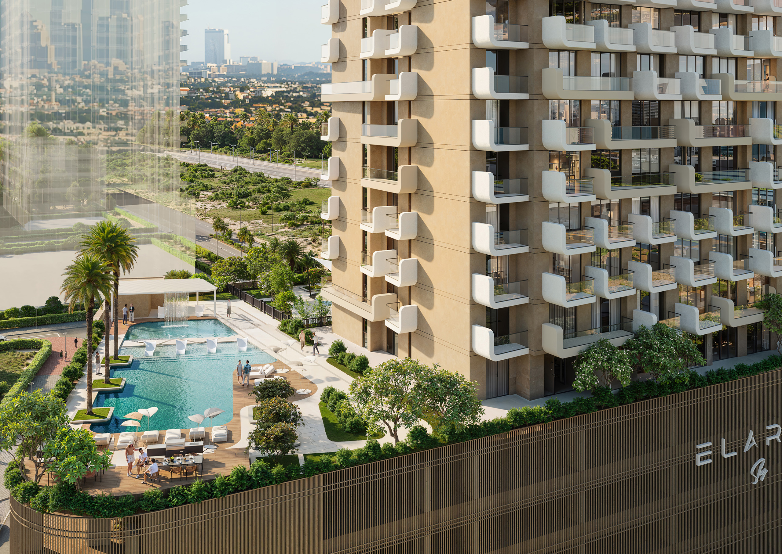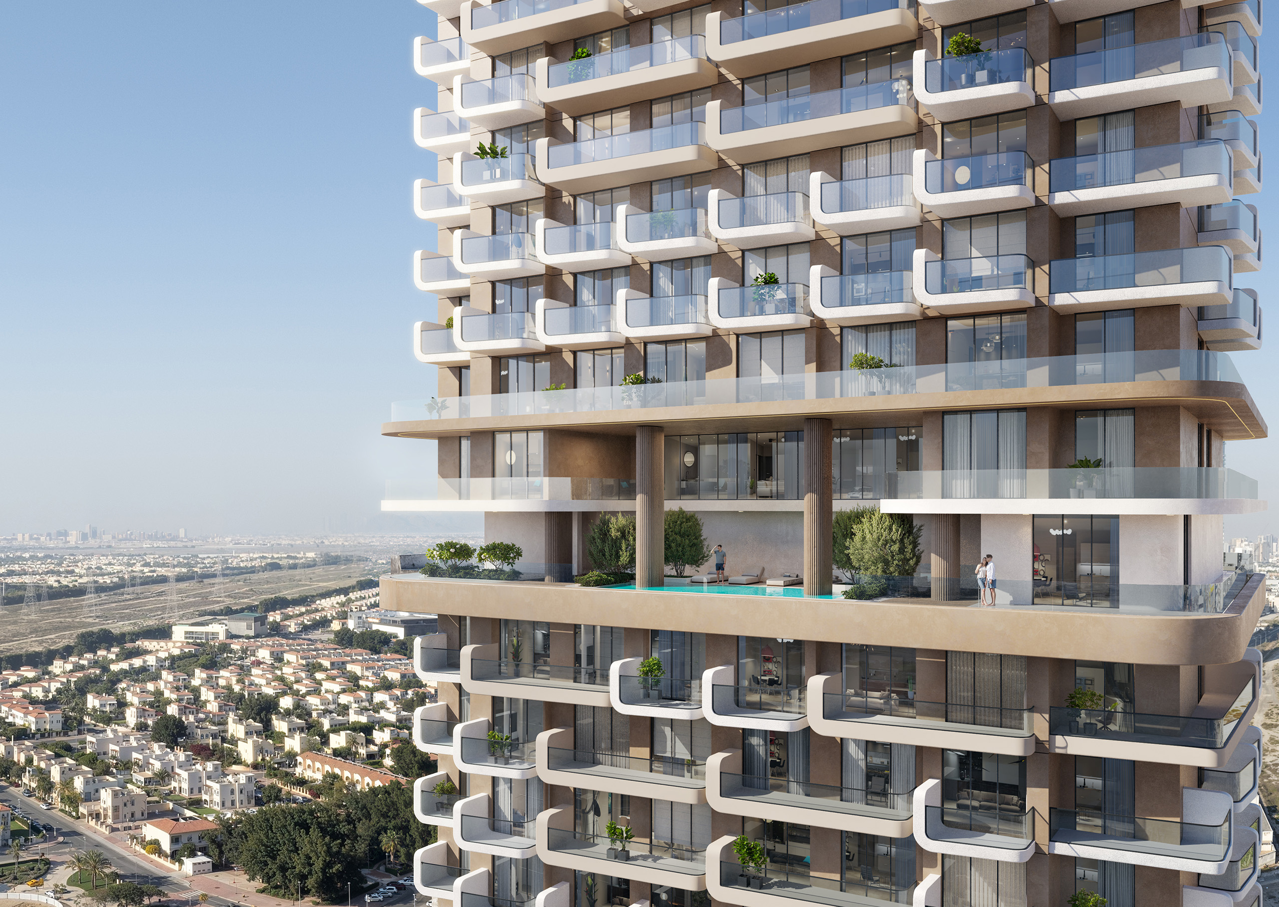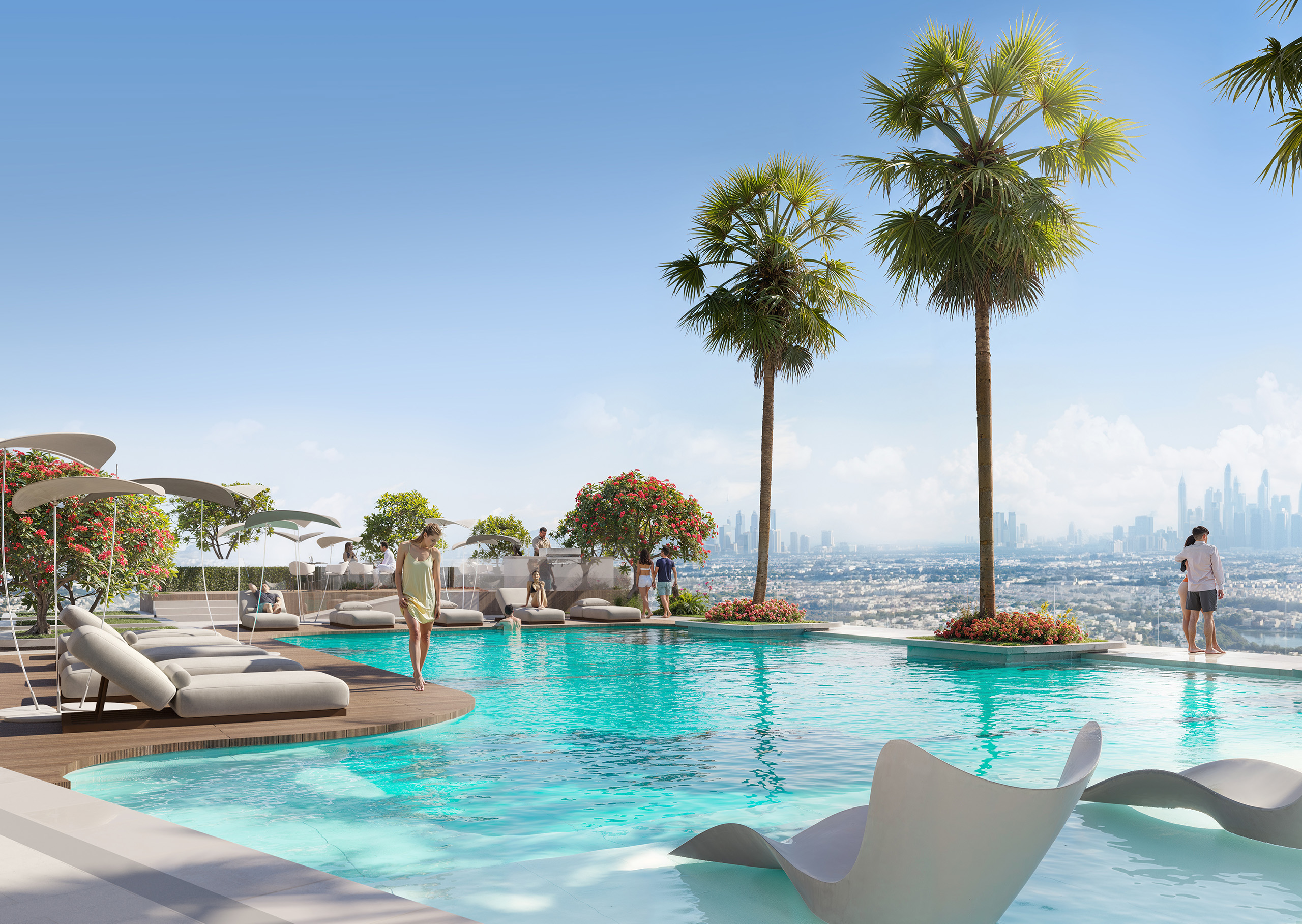 Main swimming pool (temperature-controlled), sky/infinity pool on upper levels (e.g. 18-floor sky pool), Kids’ Pool, Pool Deck, Sun Loungers, Baja Shelves