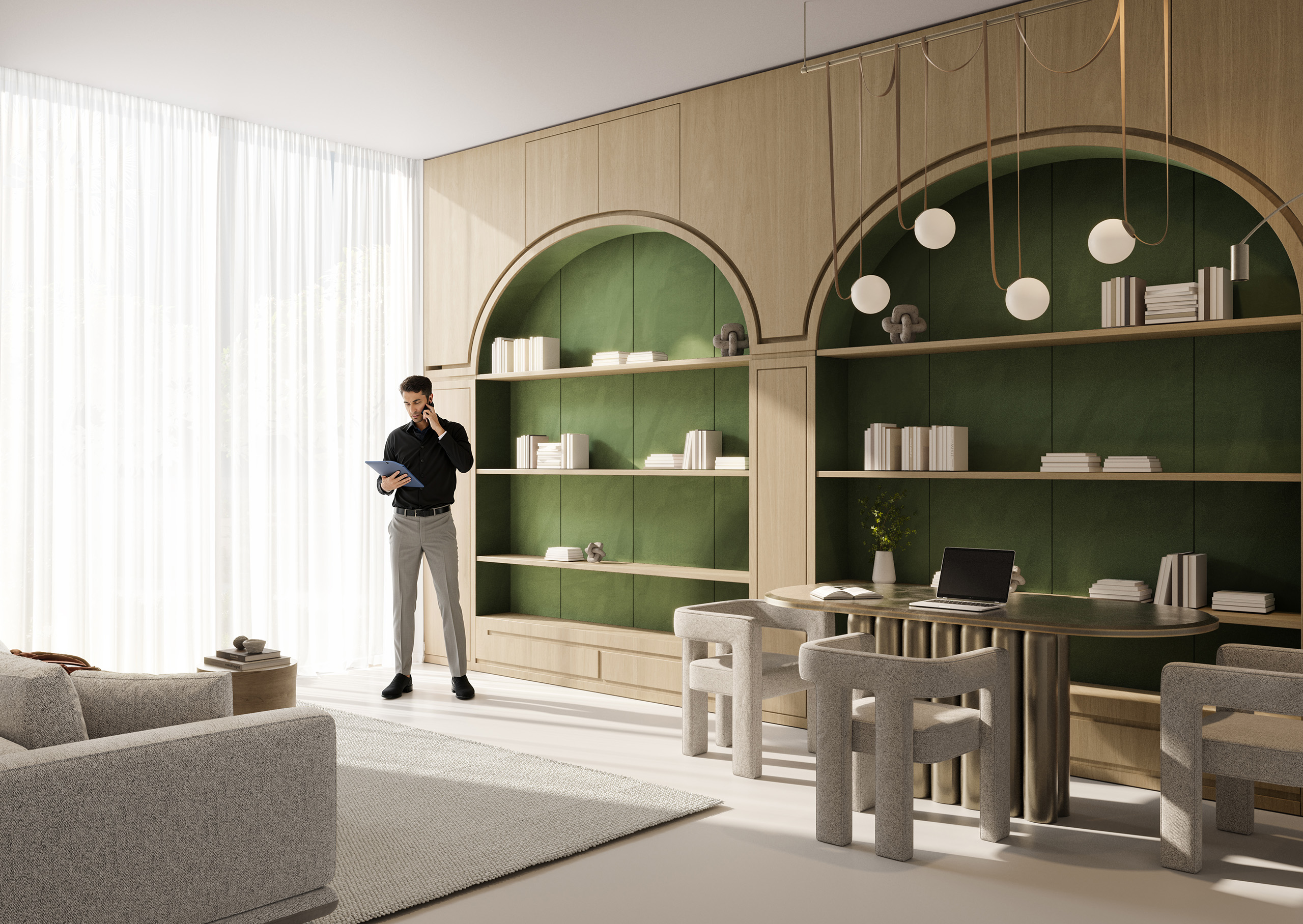 Architectural Design: Emphasis on natural light, open layouts, large windows, balconies, landscaped terraces, geometric design